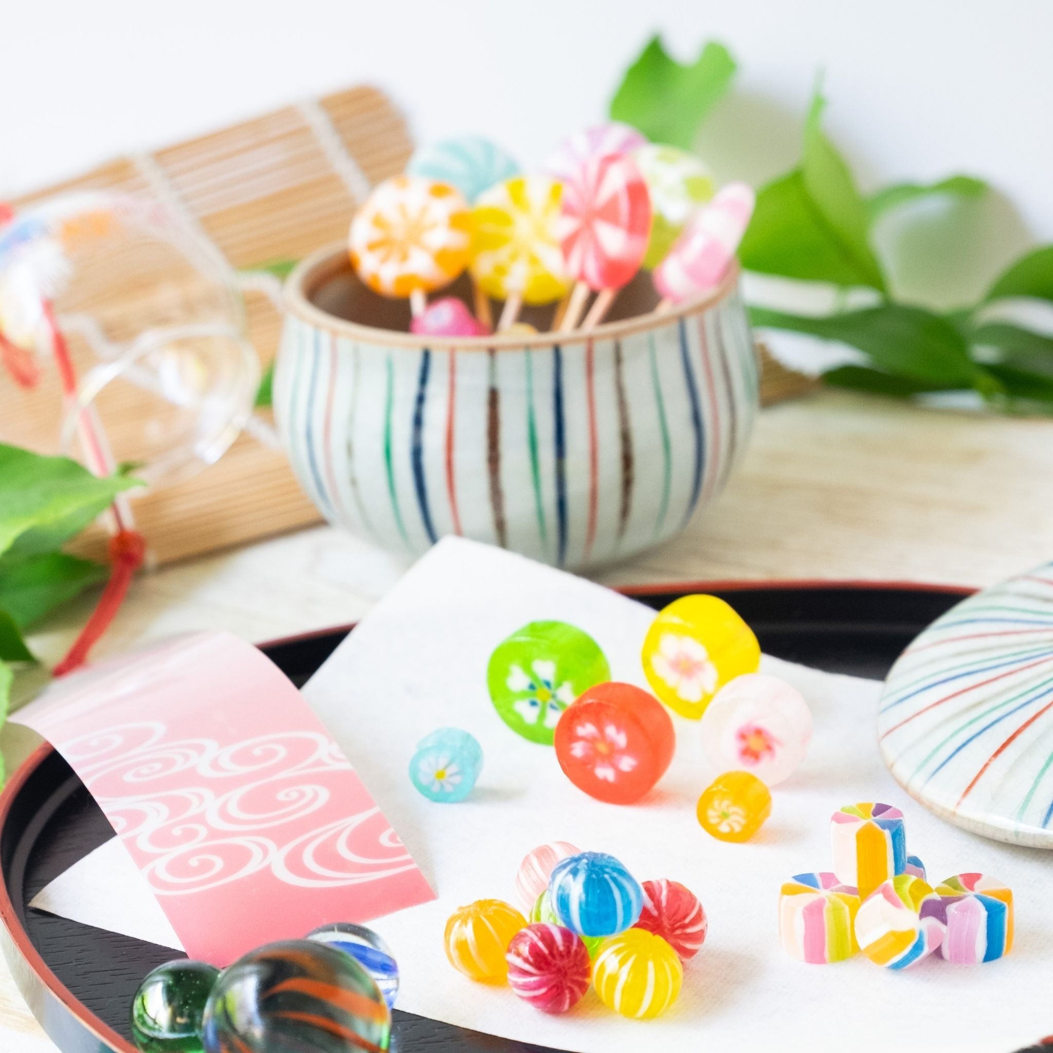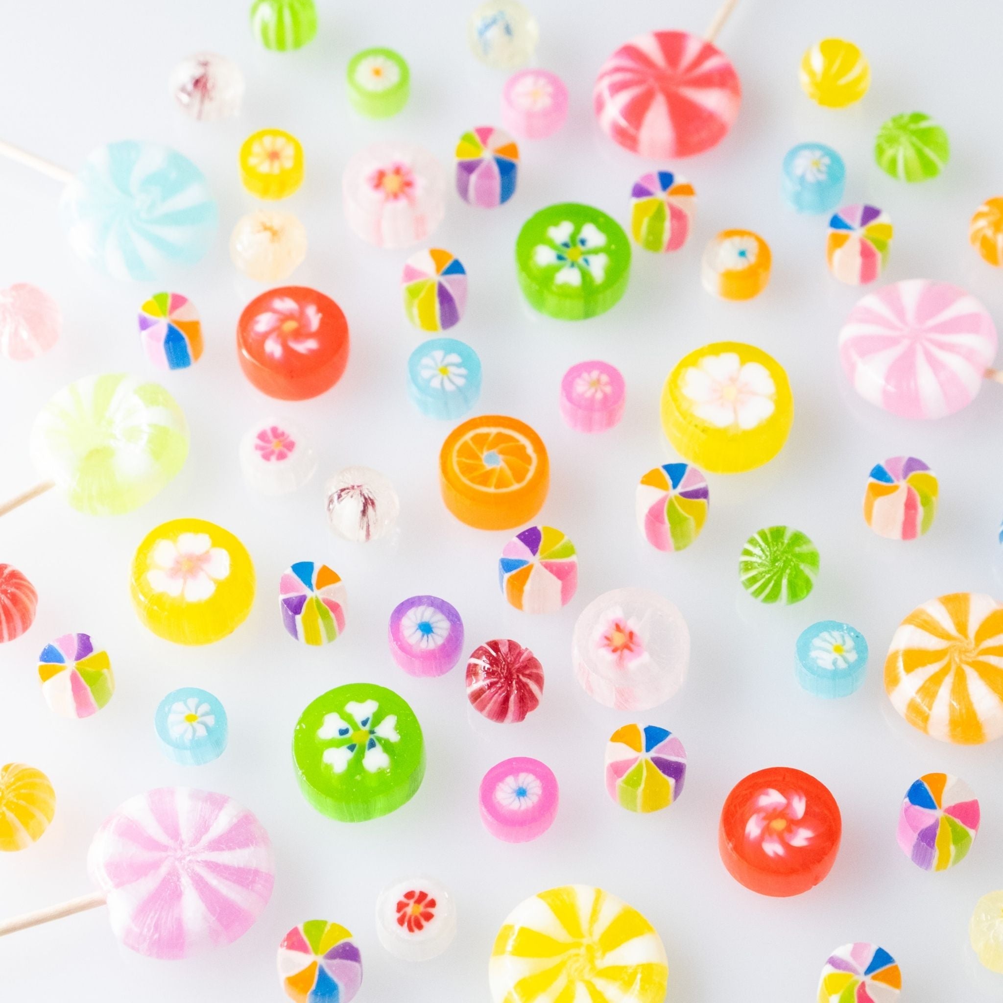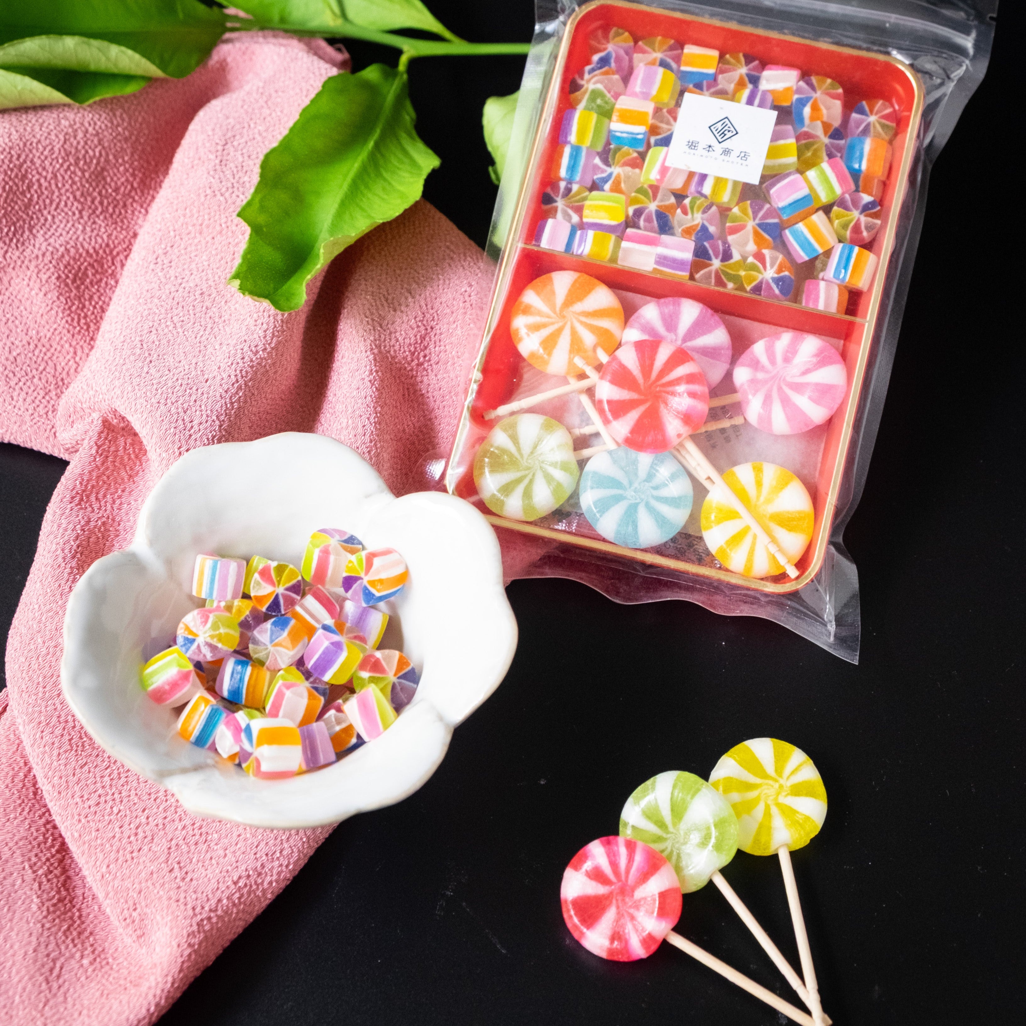 京の飴細工職人が丁寧に鮮やかに仕上げたカラフルな一粒一粒の飴は可憐で美味しく、だれもが笑顔になるような不思議な飴です。上品で爽やかな甘さがどこか懐かしくやさしい気持ちにさせてくれます。